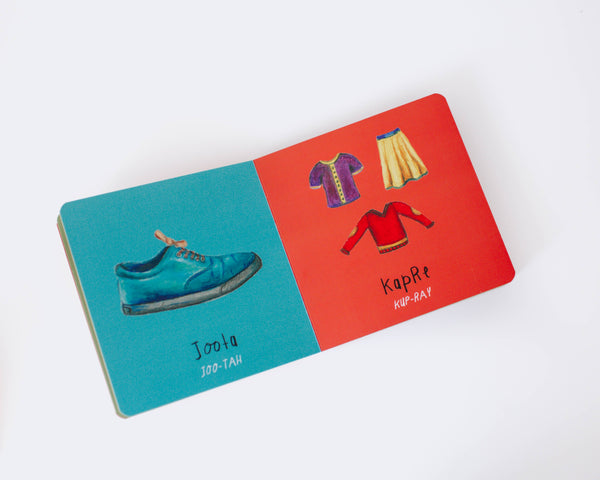Increase your baby/toddler’s Hindi vocabulary with this bright and colorful board book! Featuring familiar English lettering and phonetics for pronunciation – it is perfect for families to read, whether they speak Hindi or not. Why learn Hindi? Hindi/Urdu (known as Hindustani) is the 3rd most spoken language in the world. It is so popular that Bollywood movies are in Hindi and most South Asians can speak Hindi as a first or 2nd language.