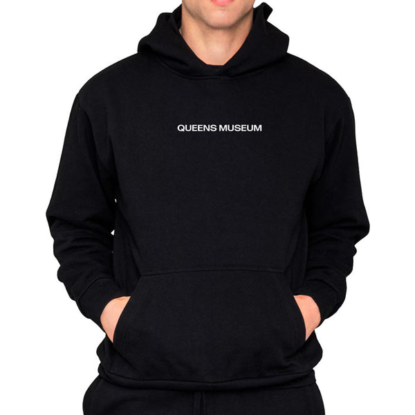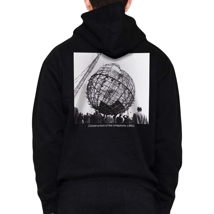 This limited edition black hoodie from Queens Museum features a screen-printed photograph of the Unisphere under construction around 1963. Made from 100% cotton, it offers both comfort and a unique historical design.